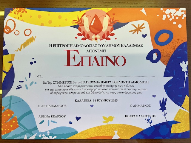 Το Σάββατο 14 Ιουνίου, πραγματοποιήθηκε από τη Δημοτική Επιτροπή Αιμοδοσίας. στην Πλατεία Δαβάκη, η εκδήλωση για την Παγκόσμια Ημέρα Εθελοντή Αιμοδότη, με στόχο την ευαισθητοποίηση του κοινού και ιδιαίτερα των νέων σχετικά με τη σημασία της εθελοντικής αιμοδοσίας.